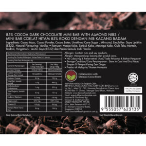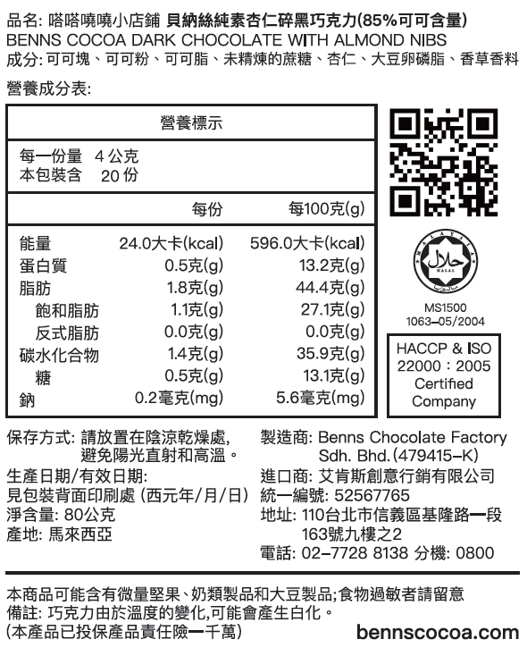 成分:可可塊、可可脂、可可粉、杏仁、未精製蔗糖:大豆卵磷脂、天然食用香料:香草(過敏原:含有堅果和豆製品)